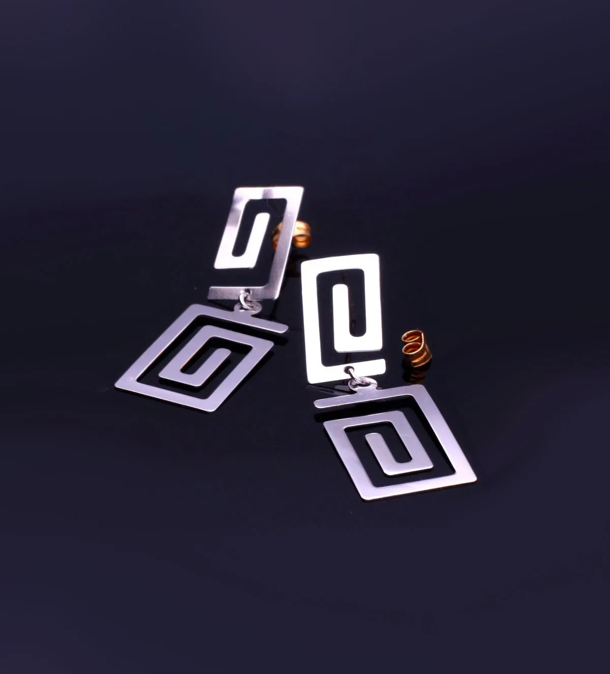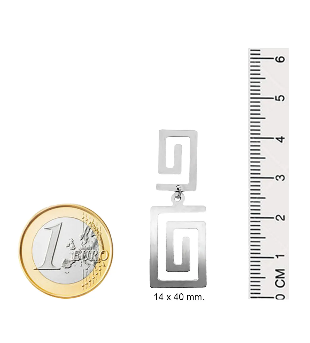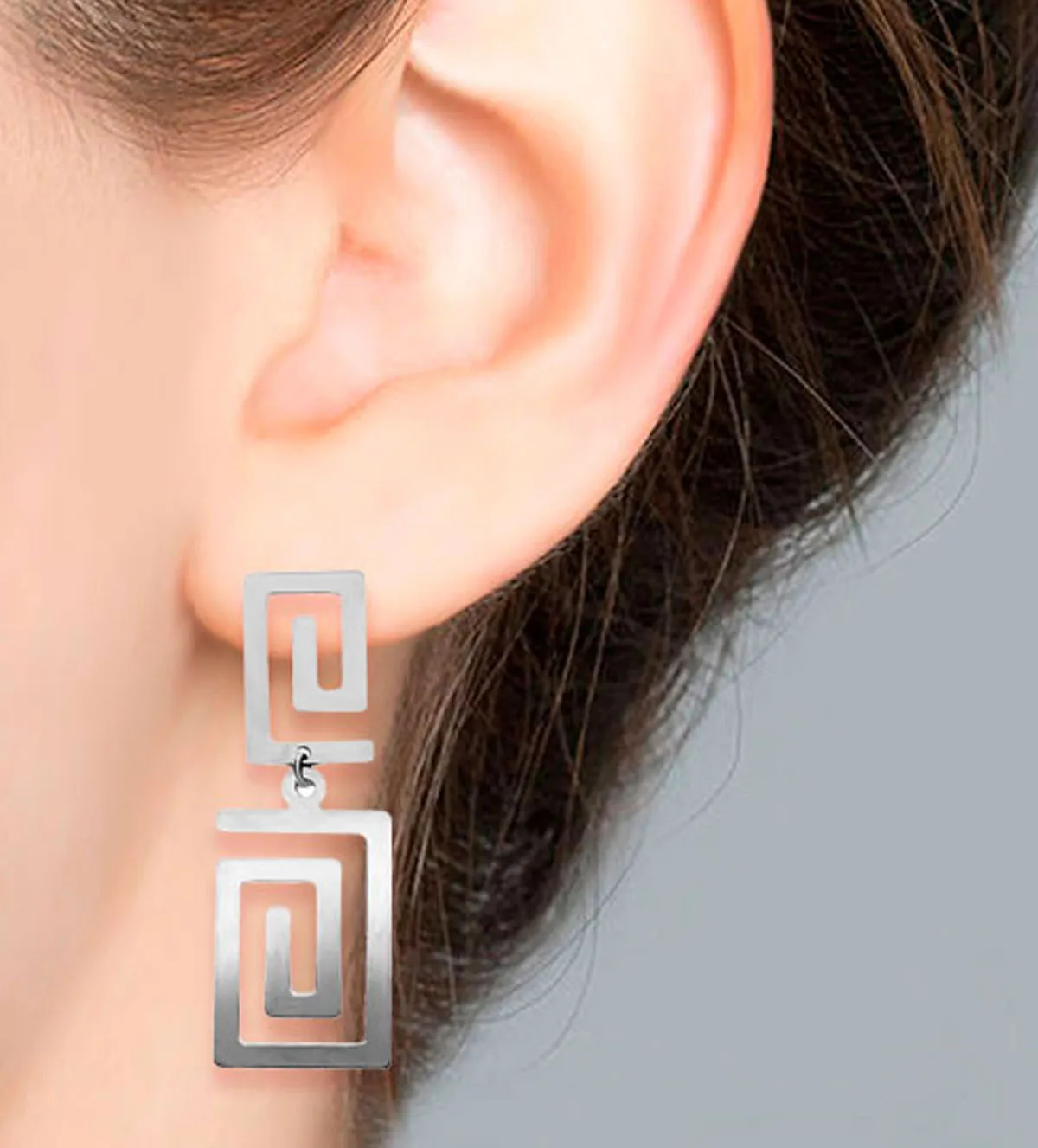 El diseño de estos pendientes de oro está inspirado en la simbología de las grecas griegas, motivo que ha sido utilizado desde la antigüedad para representar la eternidad y la armonía. Cada pendiente presenta una greca rectangular colgando de otra más pequeña, unidas mediante un pernio y sistema de presión en oro amarillo, logrando una estructura elegante, firme y perfectamente equilibrada.