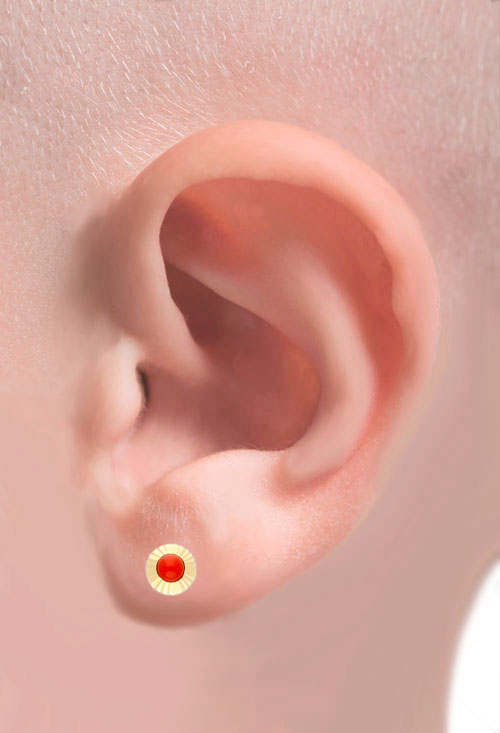 Pendientes primera puesta oro amarillo 18 kilates con coralina, clásico modelo super favorecedor para la niña bebé con una coralina redonda cabujon rodeada por un bisel lapidado que produce cientos de brillos diferentes con el movimiento. el cierre de tornillo con tope protege de molestias o arañazos a la pequeña, un regalo que va a utilizar mucho y que combina con todo tipo de ropa especialmente con la de color rosa.