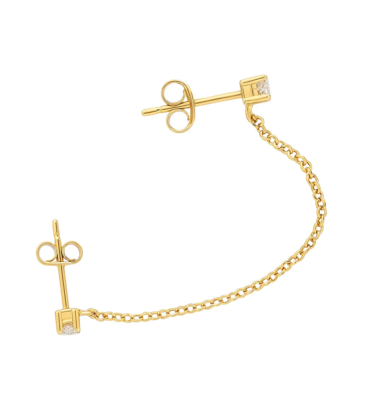 El modelo Twin se compone de un pendiente conectado por una delicada cadena, que se colocan en la misma oreja. Cada pendiente está decorado con una circonita engastada en garras, ofreciendo un brillo sutil y elegante. Este diseño no solo resalta las facciones del rostro, sino que crea un efecto visual encantador y muy favorecedor.