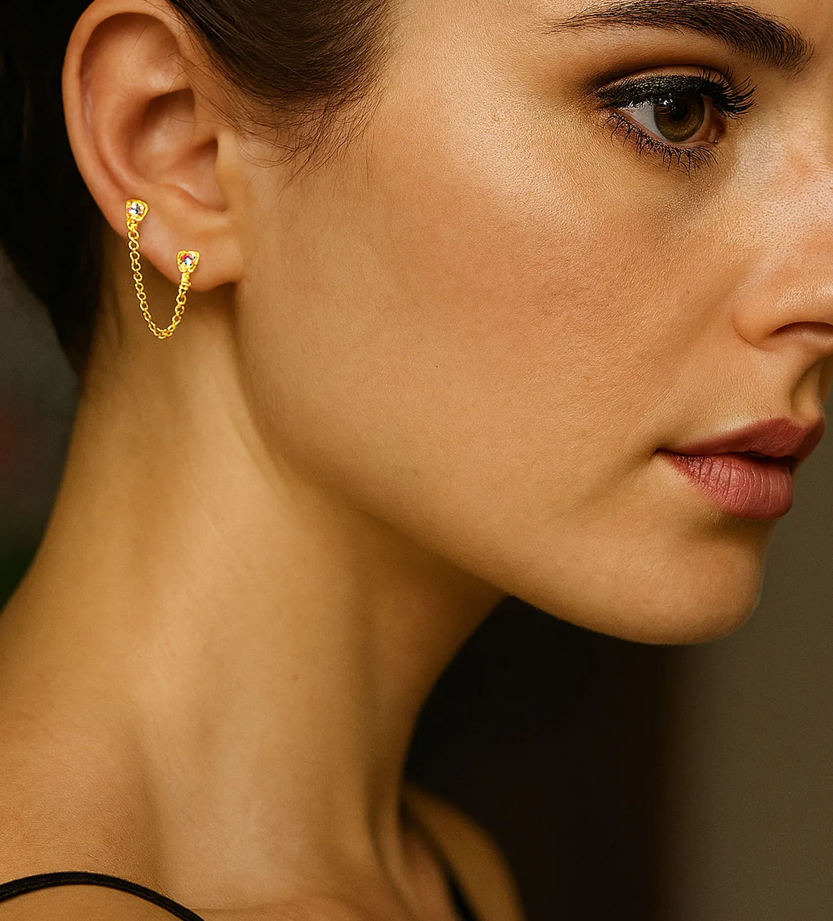 La cadena entre ambos puntos aporta movimiento y dinamismo, mientras que el brillo discreto de las circonitas engastadas centra la atención en la zona del rostro.
