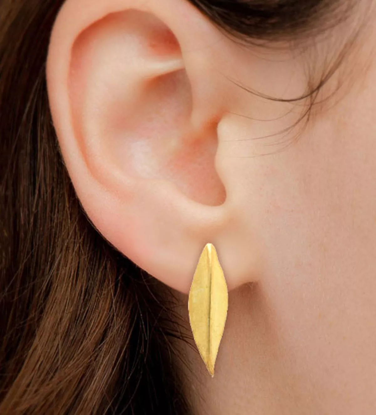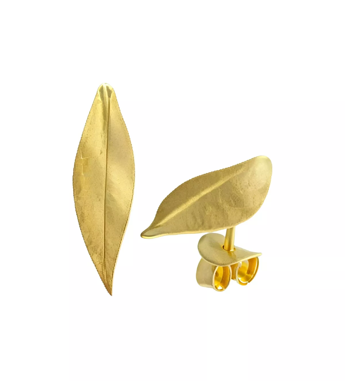 Pendientes de plata chapada oro “Orígenes” diseño de Jorge Revilla, una joya que nos traslada a los principios de nuestra aparición en la Tierra, un adorno natural que se utilizaría en todos los momentos de cualquier civilización, hoja inspirada en la Adelfa con un montón de propiedades positivas, ojo, como todos los venenos. Se ajustan a la oreja mediante sistemas de presión.