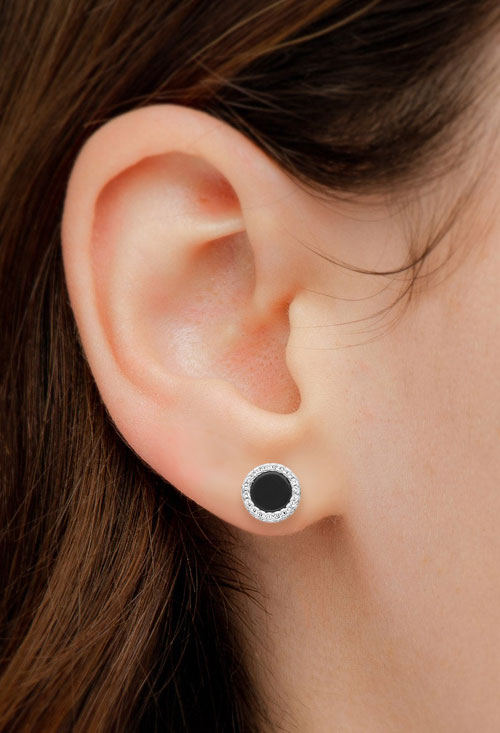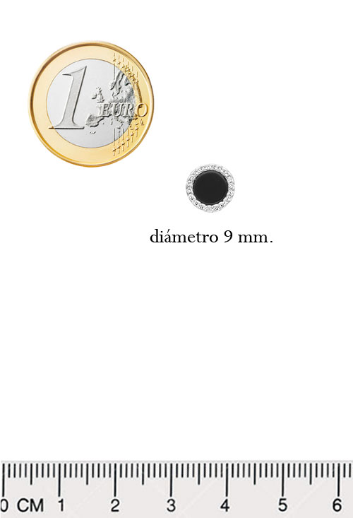 Pendientes de plata con onix y circonitas, elaborados completamente en plata de ley 925 milésimas, sometida a baño de rodio, estos pendientes son circulares con centro de onix rodeado de orla de circonitas blancas o transparentes sujetas al pendiente de manera que la luz incide en sus facetas, esto hace que las circonitas deslumbren más, dando lugar a una joya de gran belleza.