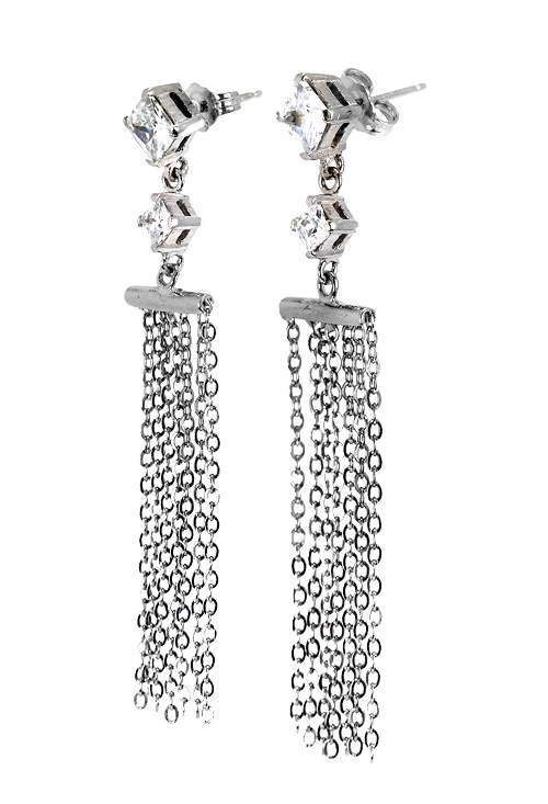Pendientes largos de fiesta en plata de ley confeccionados con flecos de cadena forzada colgando de motivo con dos circonitas de primera calidad y talla cuadrada engastadas en garra de cuatro patas y sistemas de presión con un tamaño de 11×58 milímetros son una joya para mujer muy indicados para fiesta o cóctel que con un peso de solo 4,80 gramos son fáciles y comodos de llevar a parte de elegantes y vistosos, aprovecha ahora nuestra oferta y compre online nuestra seleccion de joyería de diseño en plata de ley.