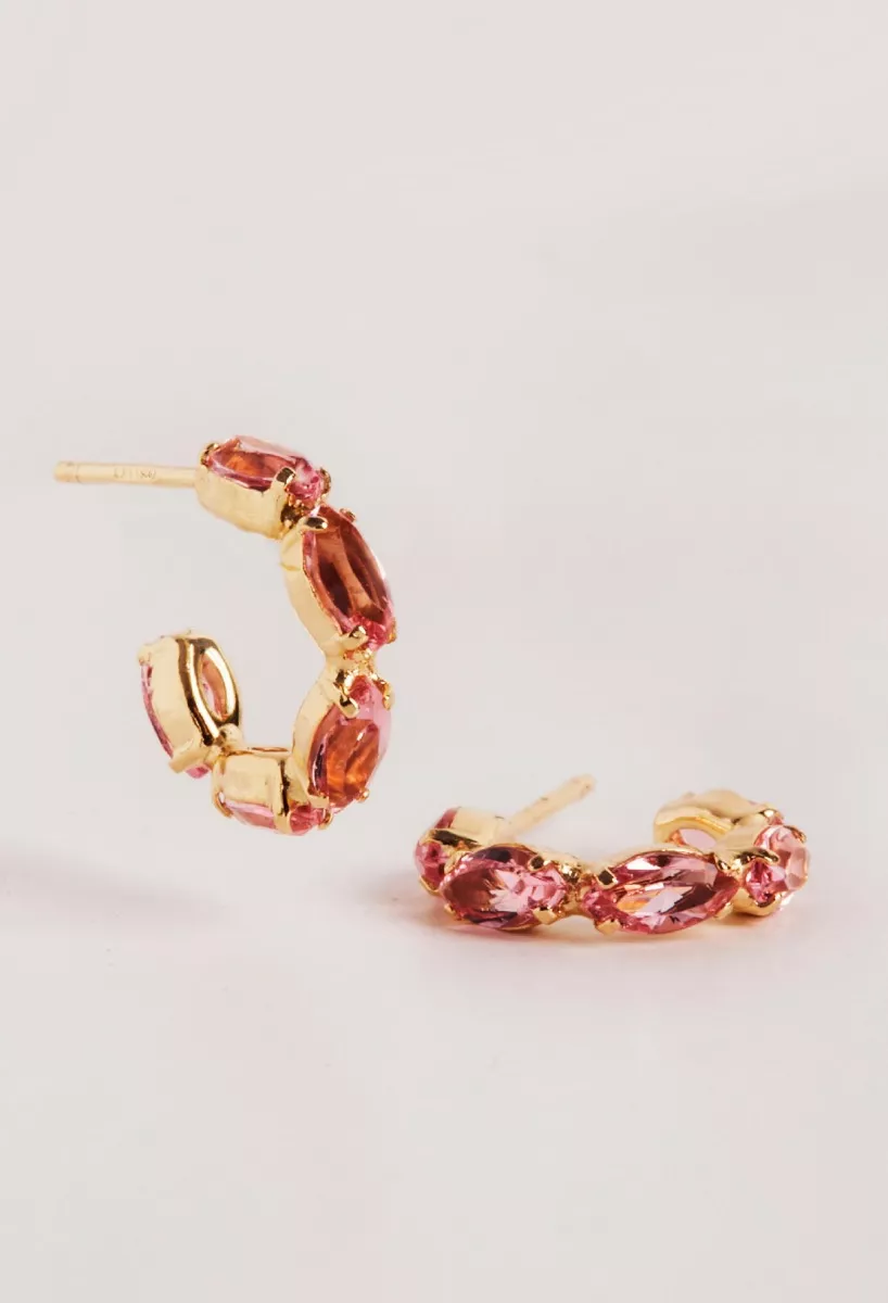 Pendientes plata de primera ley bañados en oro de 18 kilates, en estos pendientes destacan los 5 cristales color rosa tallados en forma marquesa y sujetos por un engaste de 4 garras.