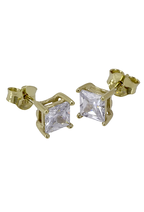 Pendientes de plata de ley chapada en oro amarillo, garra cuadrada de cuatro patas con circonita engasta de forma cuadrada, un precioso pendiente para mujer que también es utilizado por los hombres que gustan de llevar pendientes, un regalo con el que no te puedes equivocar porque siempre sienta bien.