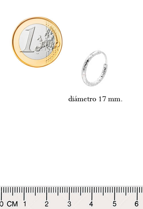 Pendientes en plata de 925 mmas, criollas aro chanela hueca redonda de 17 milímetros de diámetro exterior, novedoso modelo de criolla, chanela redonda con un acabado amartillado diferente poco convencional pero muy vistoso con brillos lapidados, se ajusta con pernio que continua con la forma del propio aro consiguiendo un bonito efecto.