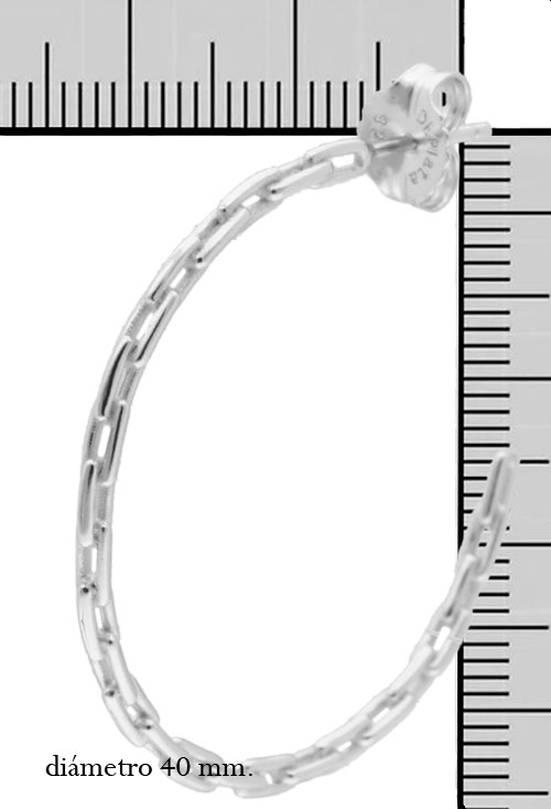 Pendientes plata criollas de eslabón forzado 40 mm de diámetro exterior, los eslabones miden 2,50 mm de ancho, este modelo se ha basado en las cadenas típicas de eslabones modelo forzado, se ajustan al lóbulo de la oreja mediante sistemas de presion, este es uno de los tamaños regulares de mayor tamaño y siempre resulta muy elegante y favorecedor.
