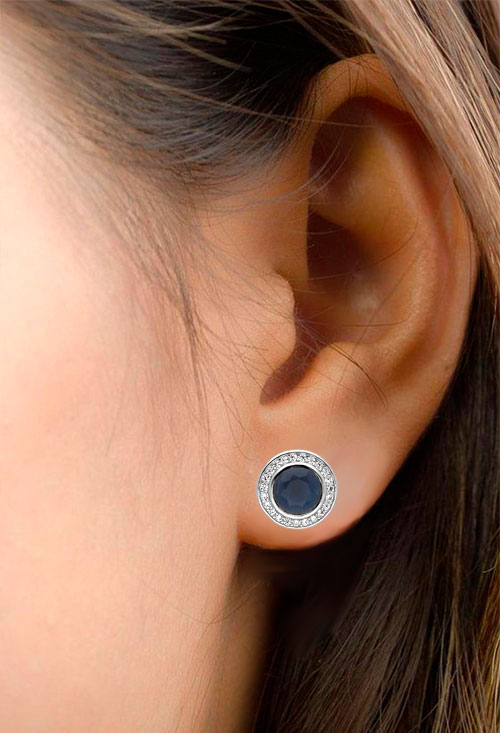 Pendientes plata y circonitas con simil azul zafiro modelo orla, bonitos pendientes que siempre agradan porque combinan con todo tipo de estilos, un simil color azul zafiro permanece en el centro engastado en boquilla y rodeado por una orla de circonitas engastadas en galería, se ajustan con sistemas de presión.