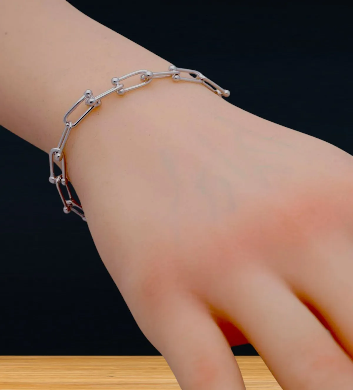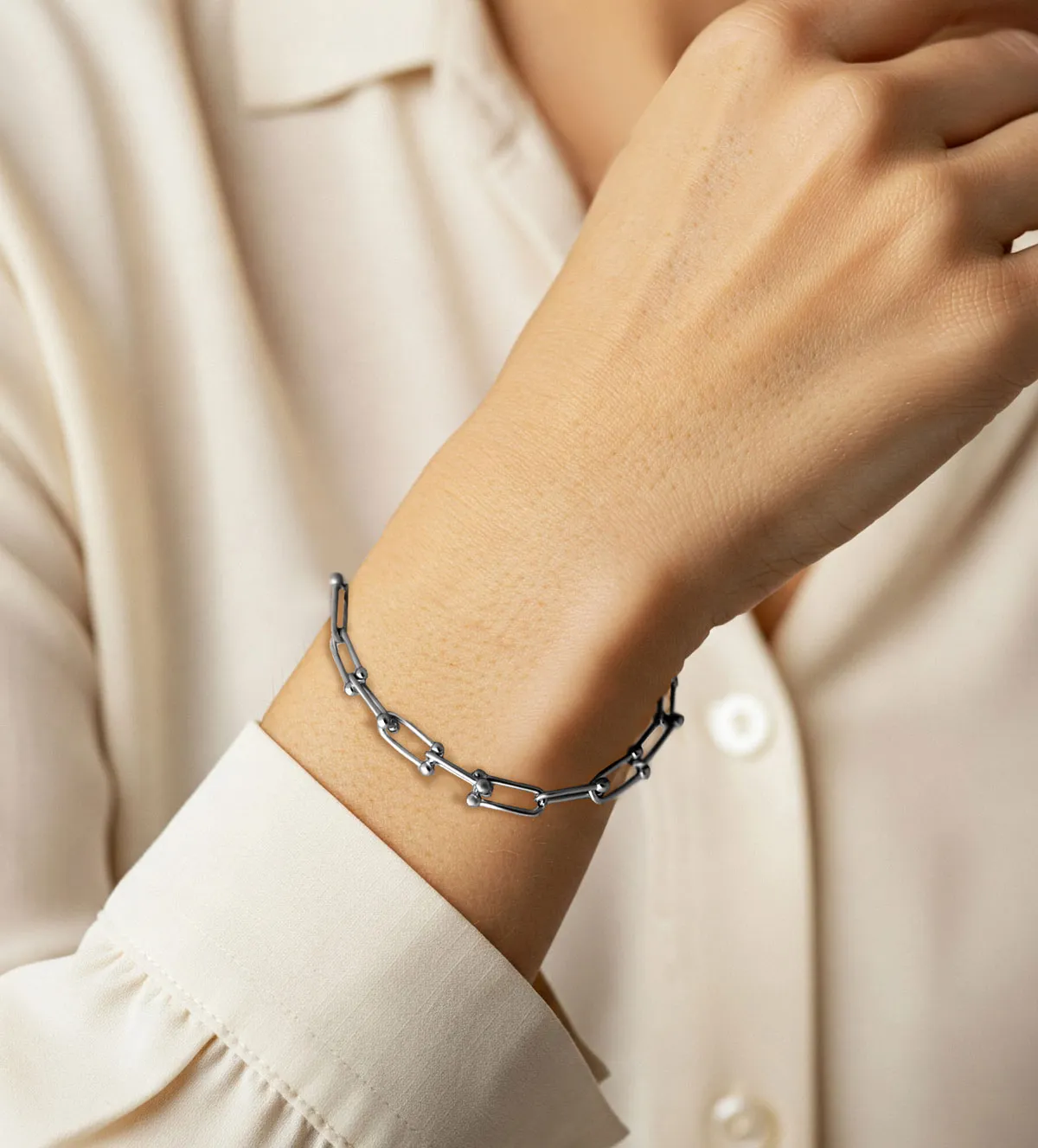 Su diseño innovador la convierte en una joya realmente especial: los eslabones en forma de U, terminados en topes esféricos, forman una estructura armónica que rompe con lo tradicional. Esta forma moderna transmite dinamismo y equilibrio, ideal para quienes valoran la exclusividad en los pequeños detalles. Además, cuenta con un cierre invisible, que se integra con elegancia sin romper la estética de la pulsera.