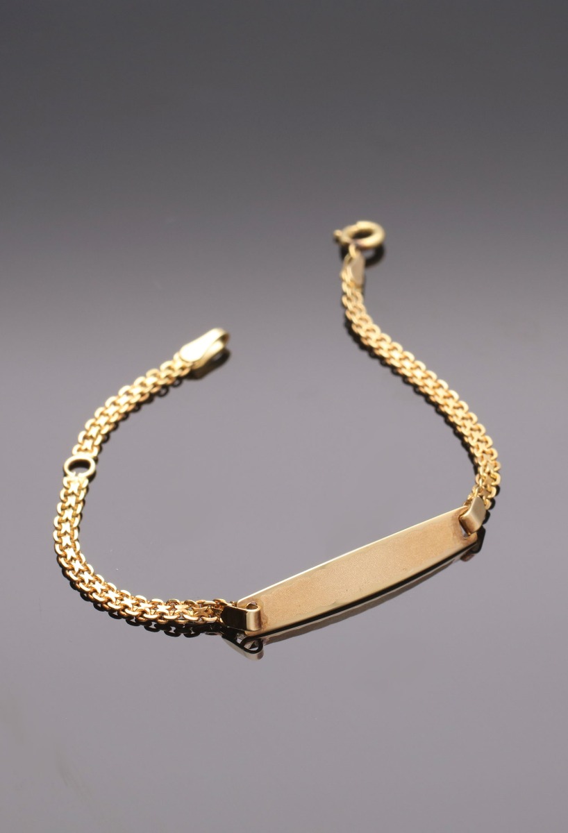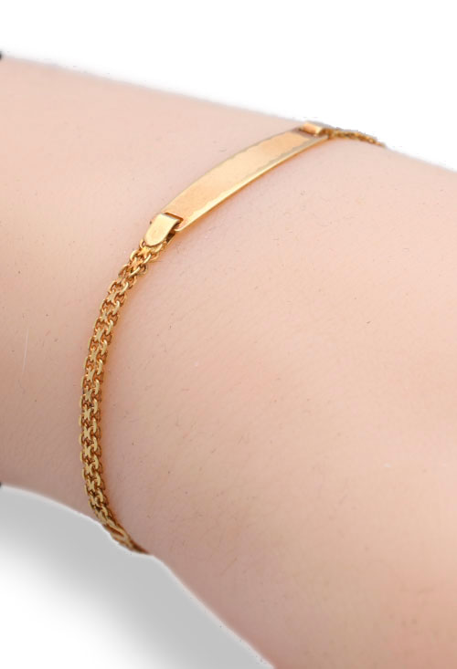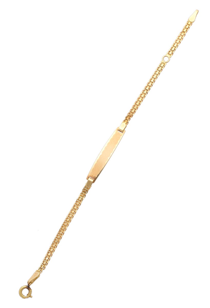Pulsera de oro 18 kilates para bebé, exclusiva pulsera tipo esclava para bebé con un acabado matizado en la chapa que hace resaltar el grabado del nombre realizado en corte de brillo, la cadena es una esterilla italiana y dispone de dos asas finales para tener dos largos diferentes y poder adaptarse desde el primer día a la muñeca del bebe y que le sirva posteriormente durante mucho tiempo, es una pulsera fuerte muy pesada para que de esa forma pueda ser un recuerdo de quien realice el regalo que dure toda la vida sin deteriorarse.
