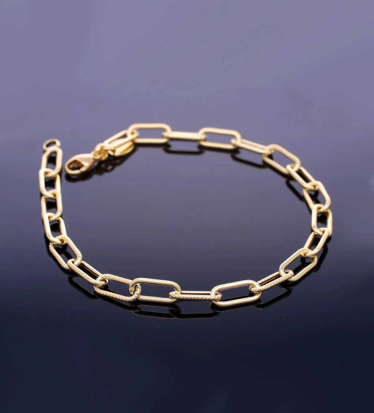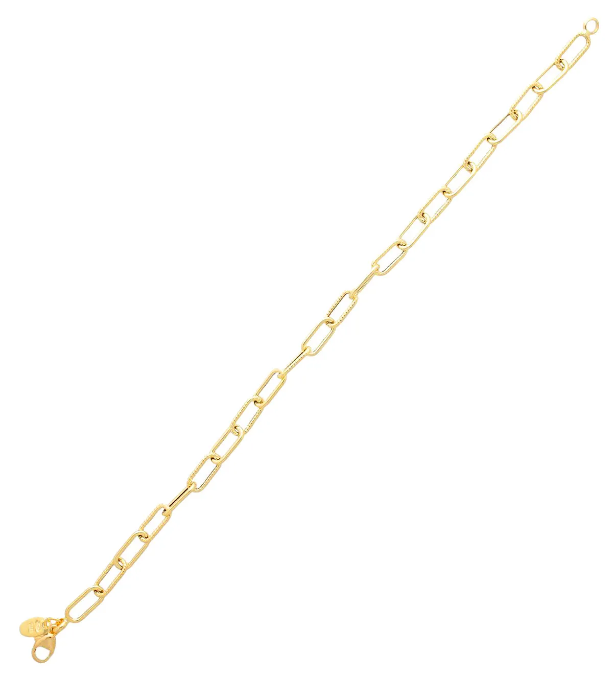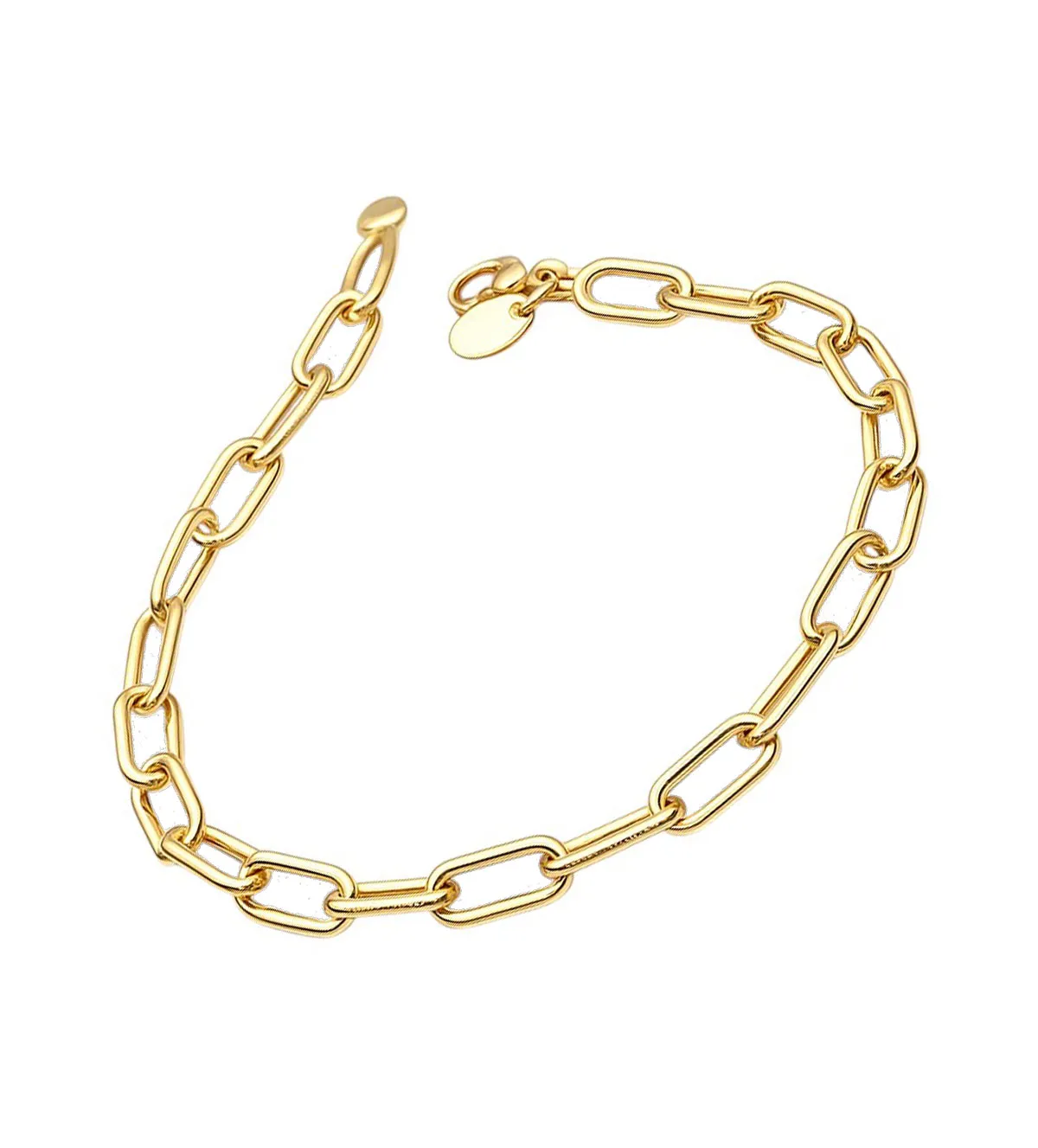 La pieza presenta una cadena de asas ovaladas con acabado en brillo, un detalle que realza su atractivo visual. Su diseño limpio y elegante permite que combine fácilmente con otros complementos, ya sean collares, anillos o relojes. Este estilo clásico pero moderno la convierte en una pulsera atemporal, perfecta para quienes buscan una joya versátil.