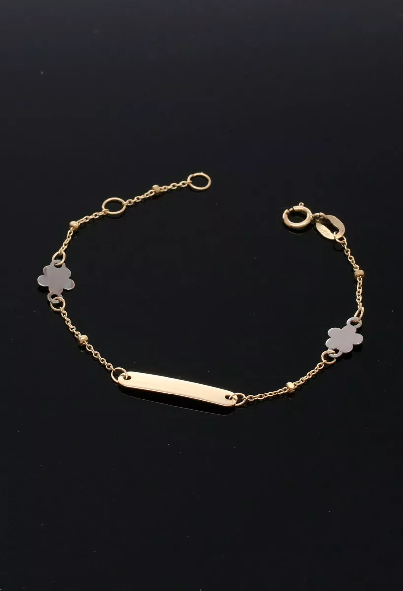 La pulsera cuenta con una cadena de eslabones programados oro amarillo con entrepiezas en forma de flor de oro blanco, un cierre de reasa y una chapa central en la que puedes grabar el nombre y la fecha de nacimiento de tu bebé.