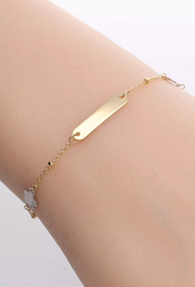 Pulsera bebe oro 18 ktes con chapa para grabar, esta esclava de oro para bebé es un bonito y elegante accesorio que quedará perfecto en la muñeca de tu pequeño. Está fabricada en oro amarillo y oro blanco de primera ley (18 quilates), un metal precioso y duradero que le dará a tu bebé un aspecto radiante.