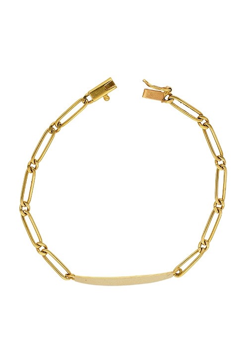 Pulsera de oro para niño o mujer tipo esclava realizada con oro amarillo de 18 kilates, las esclavas son pulseras con chapa en el centro de la cadena para poder ser grabada, la cadena de este modelo esta formada con eslabones programados uno por uno que se remata con un broche de lengüeta y cerrojillo de seguridad en forma de ocho, este modelo es perfecto como regalo de cumpleaños o cualquier otro motivo especial y especialmente indicada como regalo de Primera Comunión.