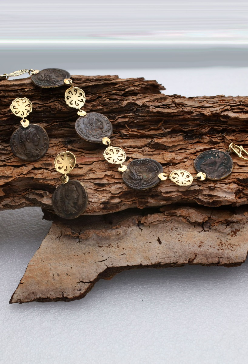 Pulsera mujer oro y monedas de bronce, Seguro que te gusta diferenciarte, te ofrecemos una preciosa pulsera de oro con monedas romanas antiguas de bronce (replicas) para los estilos más exóticos y tribales, la pulsera esta formada por 5 monedas separadas entre si por entrepiezas de oro amarillo de forma circular con calados en forma de bastoncillo a modo de greca antigua, también el cierre es especial muy seguro y fácil de poner y quitar, comprala a un fantastico precio especial para venta online.