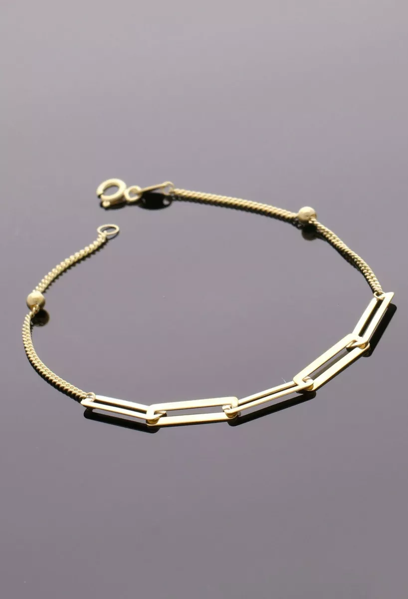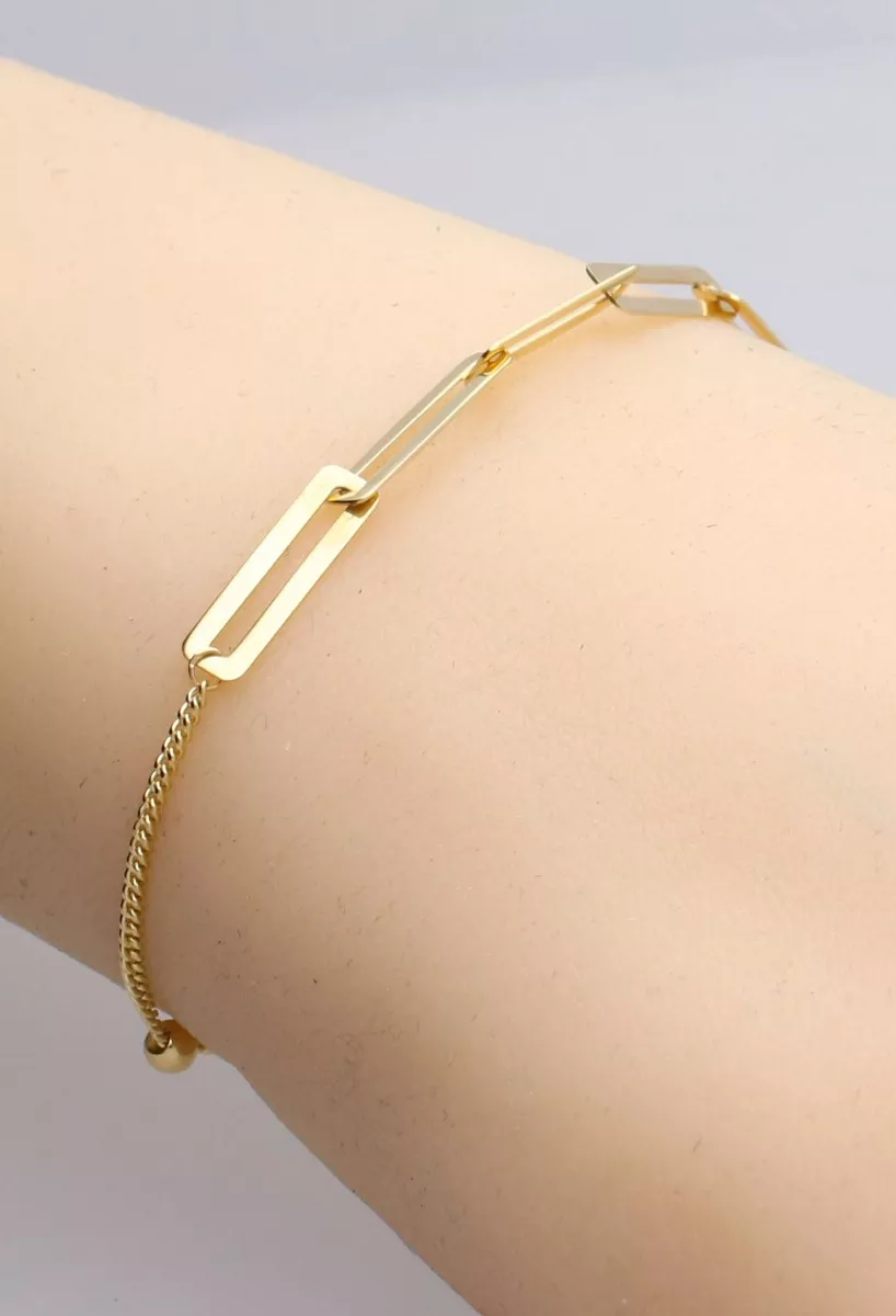 Pulsera oro 18 ktes cadena fina centro asas rectangulares, esta elegante pulsera de oro amarillo de 18 quilates es la joya perfecta para realzar tu estilo profesional. Su cadena fina, compuesta por eslabones barbados, complementada con un adorno central formado por asas planas rectangulares, denota sofisticación y buen gusto. Con un cierre de reasa que garantiza seguridad y comodidad al ajustarse de forma firme y segura, esta pulsera encantará a quienes buscan calidad y distinción en cada detalle.