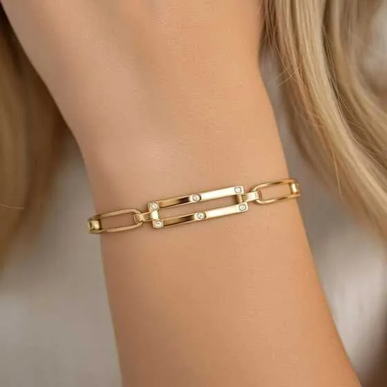 Uno de los elementos diferenciadores de esta pulsera de oro es el engaste a ras de sus diamantes, una técnica propia de la joyería fina que garantiza elegancia, protección y brillo uniforme. El contraste entre la superficie pulida del oro y los puntos de luz diamantados aporta una estética limpia y moderna. Se trata de una joya versátil, pensada para acompañar tanto looks formales como estilismos cotidianos con un toque de lujo discreto.