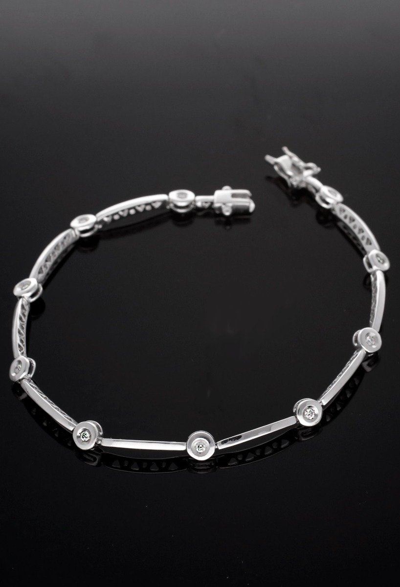 Pulsera oro blanco 18k con diamantes engastados en chatones, piensa como va a quedar esta joya en tu muñeca, esta pulsera por si sola es capaz de decir mucho sobre el buen gusto y la elegancia de quien la lleva puesta, se abrocha con un sistema de lengüeta con dos cerrojillos de ocho dispuestos en ambos laterales, puedes ser un magnífico regalo de aniversario, un aniversario inolvidable que siempre será recordado gracias a esta joya intemporal que pasara de generación en generación. Los chatones están separados por tramos rectos de oro blanco con adornos calados en sus laterales y ligeramente curvados para adaptarse lo mejor posible a la forma de la muñeca femenina.