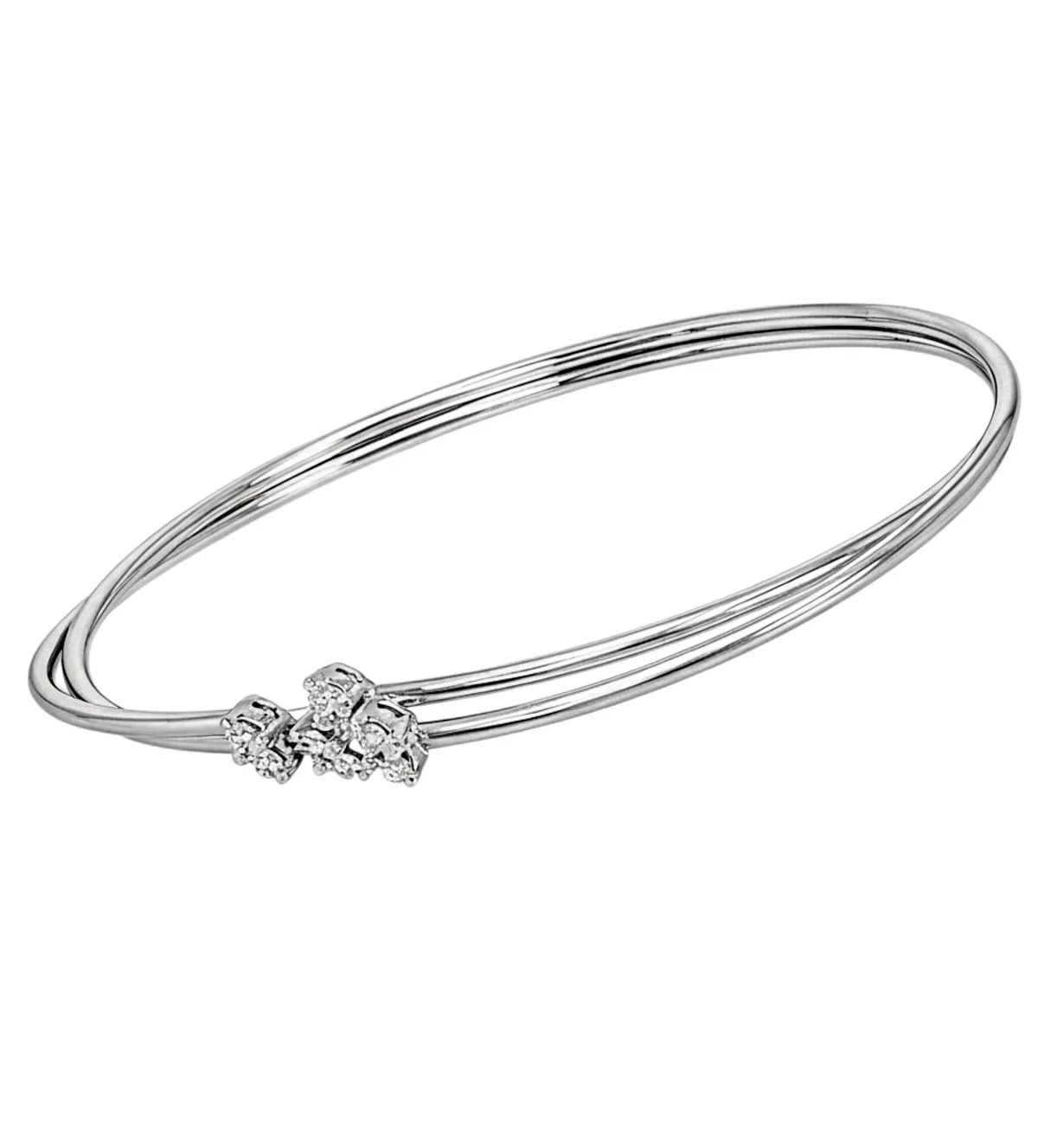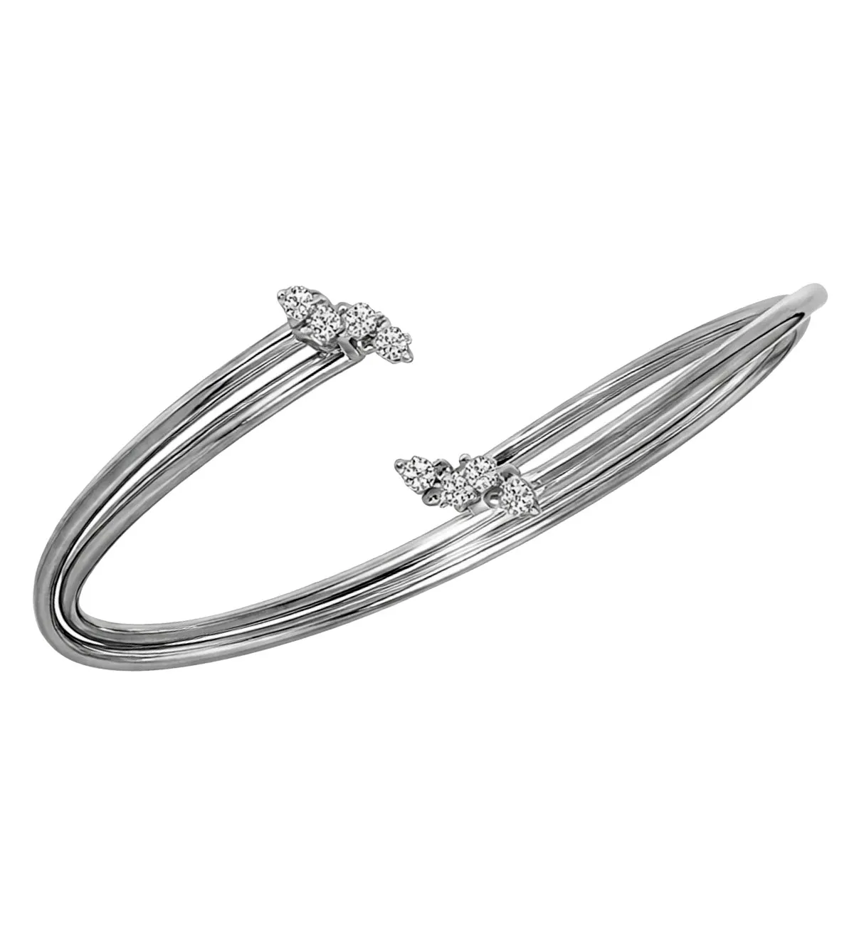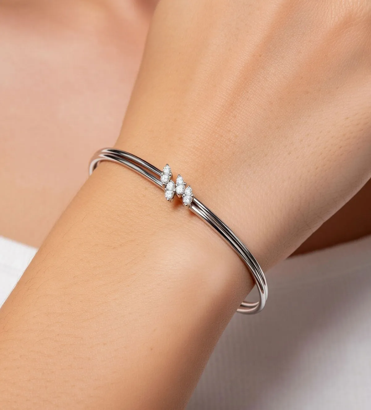 El diseño se compone de dos hilos de oro blanco que se cruzan de forma elegante en la parte frontal, creando un motivo central moderno y sofisticado. En los extremos, los terminales se encuentran rematados con diamantes que aportan un brillo equilibrado y refinado. Este juego de formas convierte a esta pulsera de oro en una pieza distintiva, pensada para destacar con discreción y buen gusto.