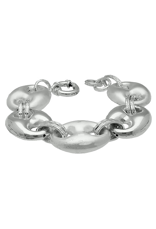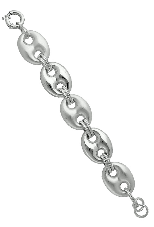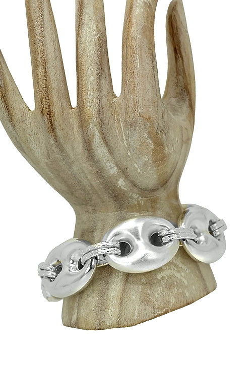 Pulsera de plata formada por eslabones de calabrote alternos uno mate uno brillo y unidos entre sí por 2 asas paralelas, se trata de una pulsera grande, de hay lo de XXL del titulo, cada eslabón mide 27×35 milímetros, la pulsera que en total lleva 5 eslabones alcanza un largo de 23 centímetros pero el tramo final que esta formado por 3 asas permite que se pueda abrochar a diferentes medidas, no podemos olvidar que al ser de gran formato necesitas largos superiores a los que se utilizan en pulseras más convencionales, la pulsera dispone de un cierre tipo mosqueton muy seguro y cómodo de quitar y poner.