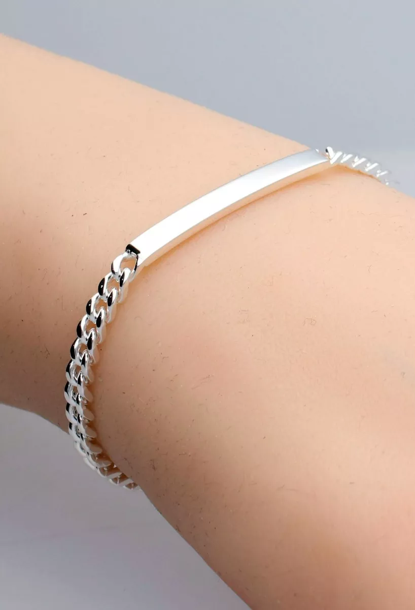 Pulsera de plata con chapa para poder grabar, bonita pulsera no me olvides con chapa para grabar nombre y fecha o cualquier otra dedicatoria que se cierra con un mosqueton, los eslabones son modelo barbado y es perfecta tanto para hombre como para mujer