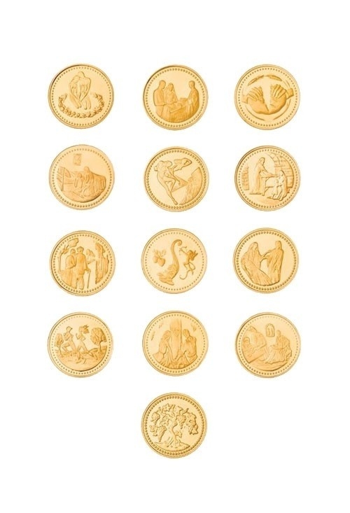 Arras de oro bíblicas para boda, conjunto de 13 monedas de 20 milímetros de diámetro todas diferentes representando cada una de ellas un pasaje diferente del Libro Sagrado, acabado mate sobre brillo espejo, el conjunto se sirve en un estuche especial en el que poder separar todas las monedas, es un recuerdo del día de la boda con mucha simbologia, ya que representa todos los bienes que los recién casados van a compartir a lo largo de toda la vida del matrimonio, compra al mejor precio en nuestra joyería online.