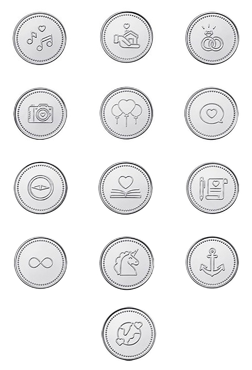 Arras de plata con emoticonos, estas arras rompen un poco con el contenido clásico que generalmente es el bíblico, ahora puedes guardar un simpático y divertido recuerdo con mensajes mas actuales y emoticonos divertidos en los cuales el mensaje de amor entre las dos personas queda totalmente claro, la buena terminación y la belleza de estas arras no dejan a nadie indiferente, son un regalo principal para el día de la boda y un recuerdo que permanecerá en el tiempo durante generaciones como el perfecto testigo de las promesas de amor realizadas.