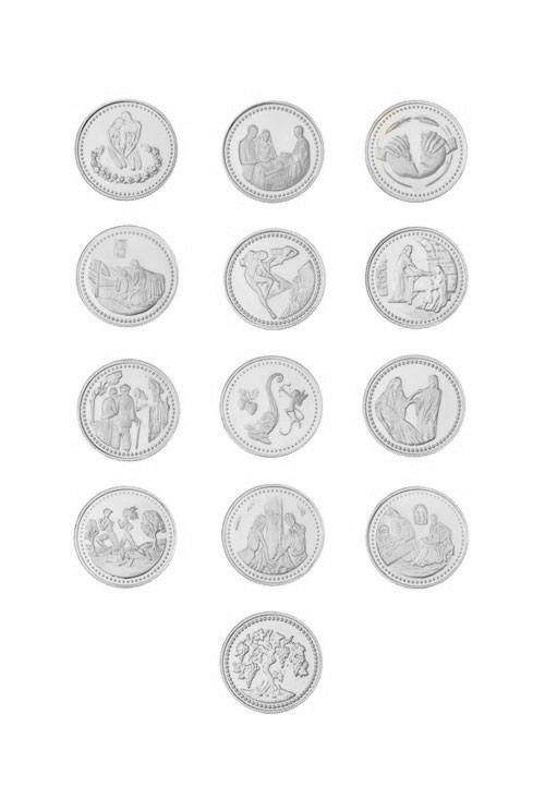 Arras de plata modelo con imágenes bíblicas para boda, conjunto de 13 monedas de 20 milímetros de diámetro todas diferentes representando cada una de ellas un pasaje diferente del Libro Sagrado, acabado mate sobre brillo espejo, el conjunto se sirve en un estuche especial en el que poder separar todas las monedas y con una bandeja donde poder llevarlas el día de la ceremonia, es un recuerdo del día de la boda con mucha simbologia, ya que representa todos los bienes que los recién casados van a compartir a lo largo de toda la vida del matrimonio y suele ser un regalo que pasa de generación en generación como un recuerdo inmortal que forma parte del patrimonio familiar, cómpralas al mejor precio en nuestra joyería online.