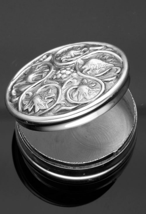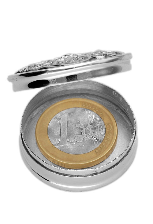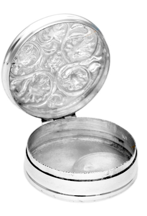 Caja pastillero de plata, cierre de clik, forma circular caja con arabescos florales en bajo relieve, un regalo original para recordar de por vida un momento especial, puede servir como elemento decorativo o de colección o para realmente utilizarlo como pastillero, aprovecha nuestra oferta y compra al mejor precio.