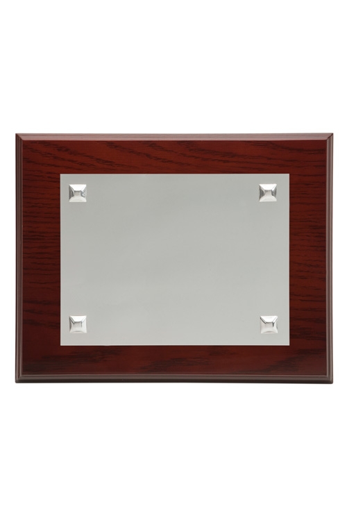 Placa de homenaje en alpaca y madera noble, la chapa en terminación matizada se acopla a la madera simulando cuatro clavos esquineros lo que le aporta un toque especial de identidad propia, esta placa conmemorativa resulta perfecta para realizar cualquier tipo de grabación que si se trata de un texto normalizado esta incluido en el precio, para grabar fotos, logos o firmas podéis consultarnos el presupuesto y el tiempo de entrega, te aseguramos un trabajo de calidad al precio más barato posible, nuestra joyería online esta especializada en grabaciones especiales.