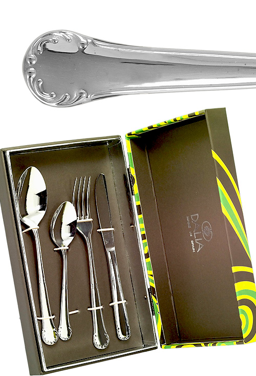 Juego de cubiertos de comunión para niño, en acero inoxidable 18/10 de la colección Victoria, 4 piezas. Grosor 2,5 mm. Cuchillos enmangados (permite afilado de alta calidad). Con excepcional estuche de regalo.