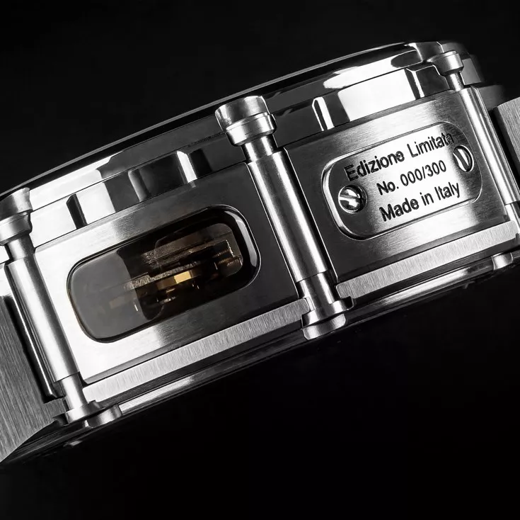 El Reloj U-Boat Chimera destaca por su caja de acero AISI 316L y bisel de tungsteno pulido, asegurando durabilidad y resistencia. Su gran tapa de corona atornillada garantiza una hermeticidad de hasta 100 metros. Además, cuenta con una ventana lateral de cristal mineral ahumado que permite admirar su mecanismo interno.
