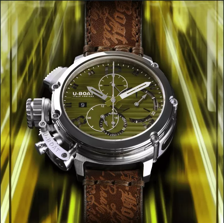 Reloj U-Boat Chimera 46mm Chrono SS Verde 9591 esfera verde rayada, ofreciendo una experiencia tridimensional única. Limitado a 300 piezas, incluye un sistema patentado de liberación de la corona para ajustar fecha y hora fácilmente.