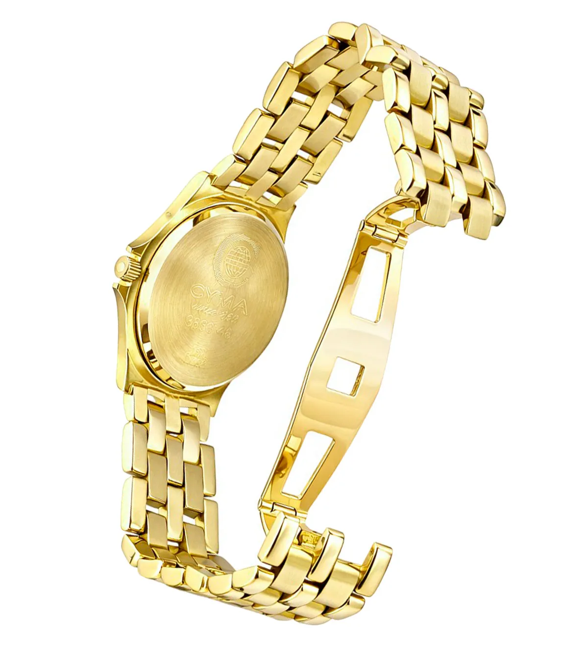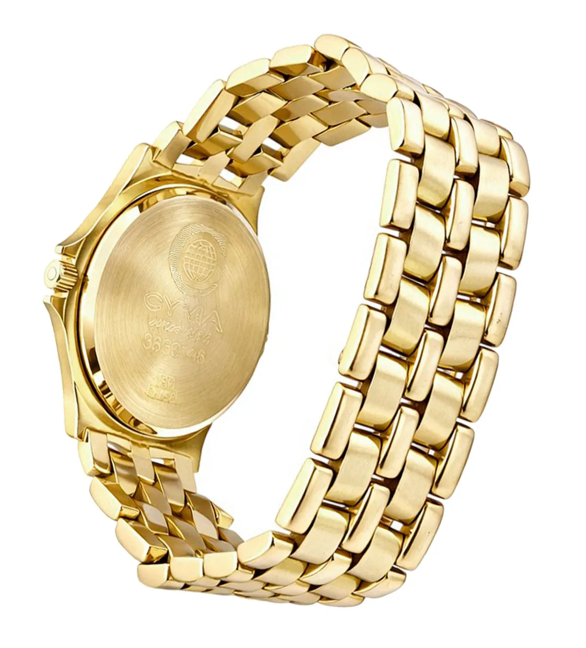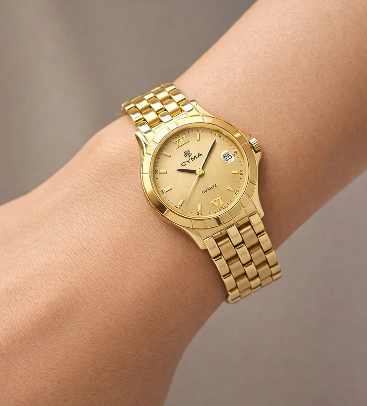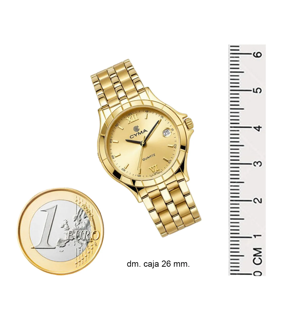 Reloj de oro de mujer, elaborado en oro amarillo de 18 quilates, combina elegancia y funcionalidad. Marca Cyma, con maquinaria suiza, cristal zafiro y esfera champán con detalles dorados y calendario a las 3. Brazalete de eslabones mate-brillo y cierre de seguridad, garantiza estilo y comodidad. Su caja de 26,50 mm y brazalete de 14 mm lo convierten en el accesorio ideal para cualquier ocasión. Con un peso sólido de 53,50 g, es un lujo atemporal. ¡En stock y con entrega inmediata, no te quedes sin él!