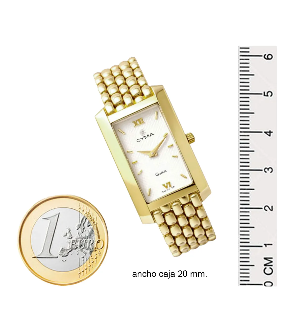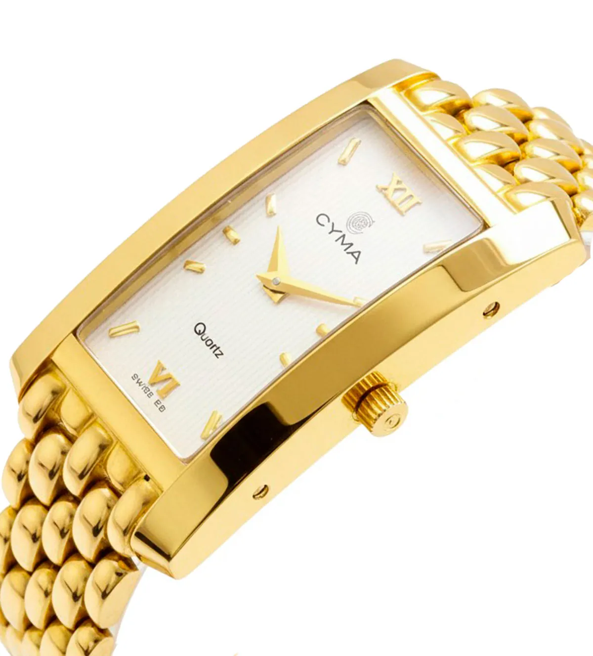 Elegancia refinada con este reloj de oro para mujer de la marca Cyma. Su caja rectangular (20×27.6 mm) y brazalete tipo panther de eslabones brillantes combinan a la perfección con una esfera blanca clásica de índices dorados y números romanos. El cristal de zafiro irrayable protege un mecanismo suizo de cuarzo de alta precisión. Con 46.50 gramos, este diseño atemporal es ideal para cualquier ocasión. Producto exclusivo en stock con entrega inmediata. ¡Hazlo tuyo ahora y convierte un regalo en un recuerdo eterno antes de que se agote!