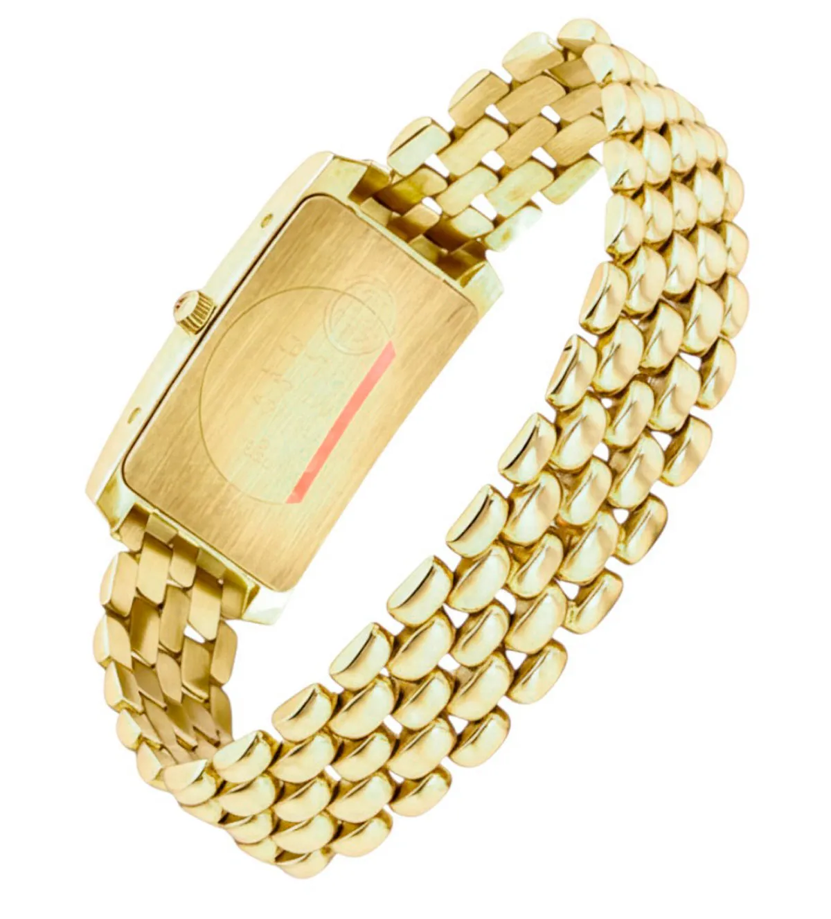 El diseño de este reloj combina líneas simples con detalles exquisitos que capturan la atención. La caja rectangular (20×27.6 mm) con biseles planos y acabado brillante enmarca una esfera blanca decorada con índices dorados y números romanos a las 12 y las 6. Este contraste elegante resalta la simplicidad y la sofisticación de la pieza, convirtiéndola en un accesorio perfecto para cualquier estilo o ocasión. Su brazalete, con un diseño tipo panther de eslabones brillantes, agrega un toque moderno a su clásica belleza.