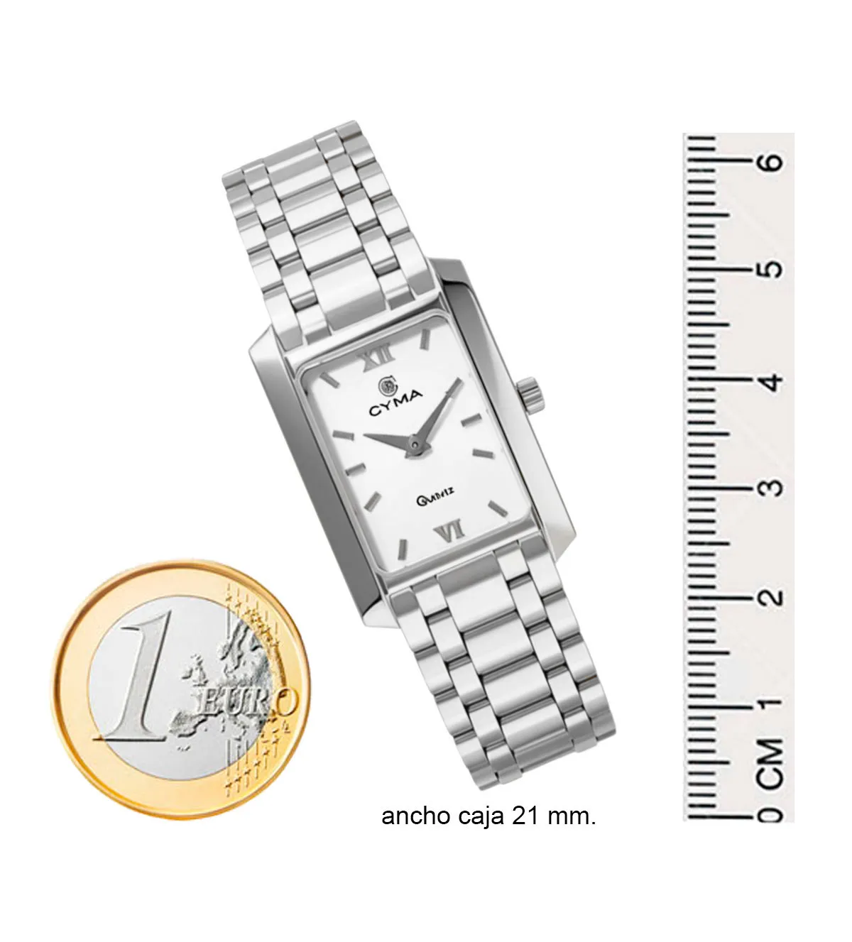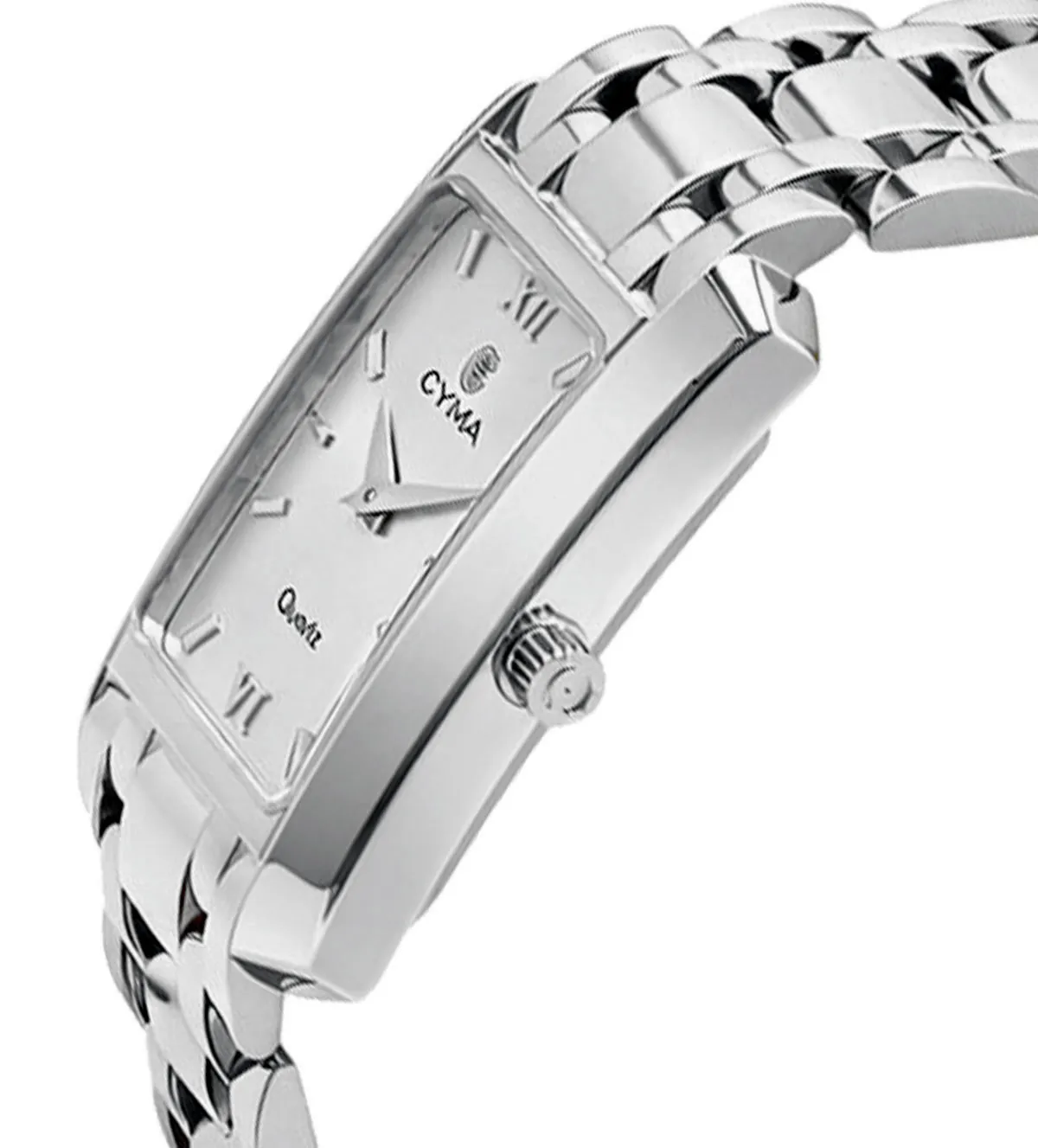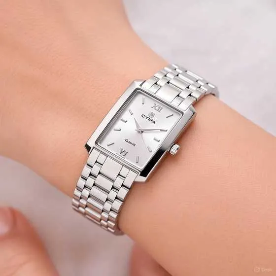 El diseño del reloj de oro blanco para mujer Cyma destaca por sus líneas rectas y sencillas que otorgan una estética elegante y atemporal. La caja rectangular, con biseles planos y acabado brillante, es un ejemplo perfecto de cómo un diseño minimalista puede ser sofisticado y funcional. La esfera blanca, con índices y números romanos a las 12 y a las 6, se distingue por su claridad y belleza, mientras que la maquinaria suiza de cuarzo garantiza una precisión impecable.