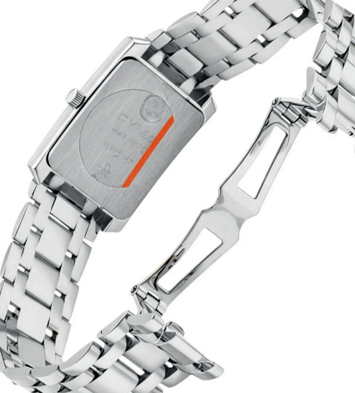Los eslabones del brazalete, con una terminación de rodio brillante, están perfectamente diseñados para complementar la caja rectangular de 20,80 x 22,80 mm. Este reloj tiene un peso aproximado de 59 gramos, lo que proporciona una sensación de robustez sin perder la ligereza y comodidad al llevarlo.