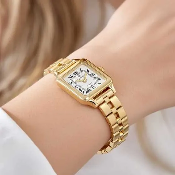 El diseño de este reloj de oro es una fusión de elegancia clásica y contemporánea. Su caja cuadrada, combinada con la esfera blanca y los números romanos dorados, otorgan al Letual un toque atemporal que nunca pasará de moda. El brazalete, hecho de eslabones que combinan acabados mate y brillo, acopla perfectamente con la caja, creando una unidad visualmente armoniosa. Este reloj no solo es una joya, sino una declaración de estilo que añade un toque de lujo discreto a cualquier atuendo.