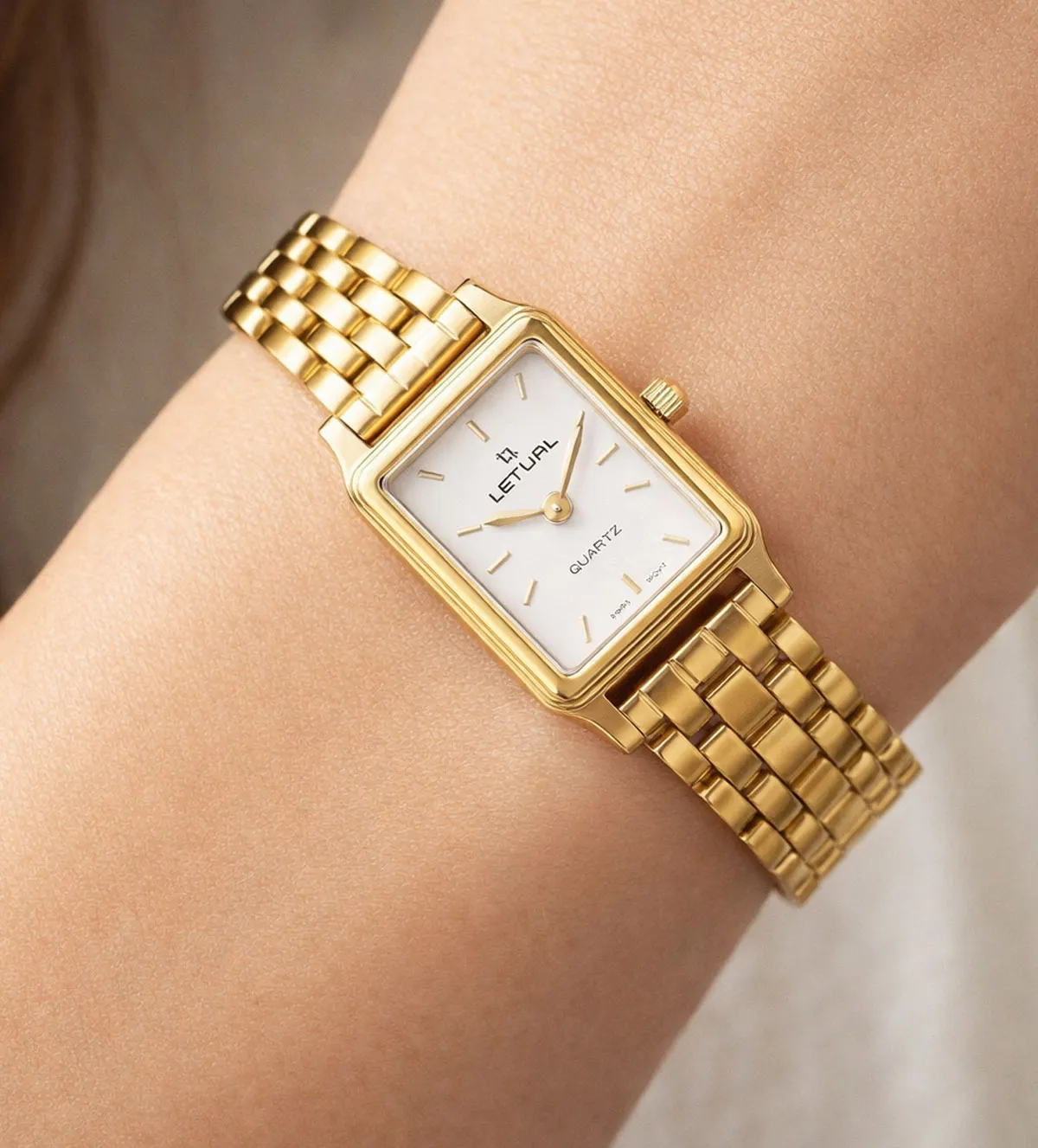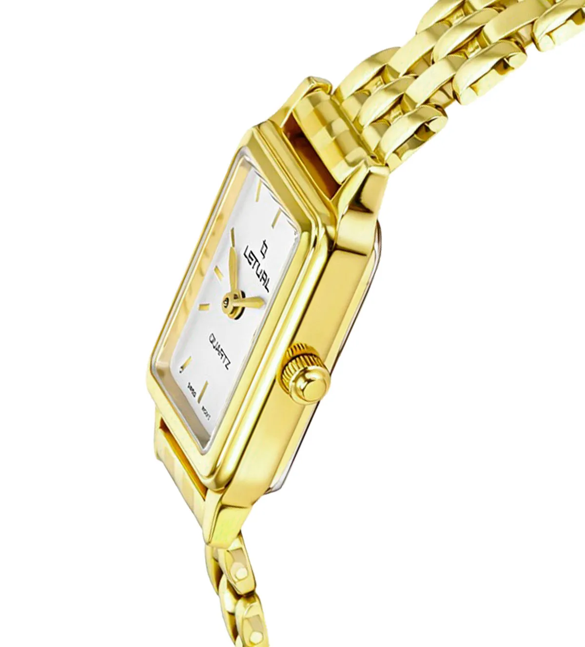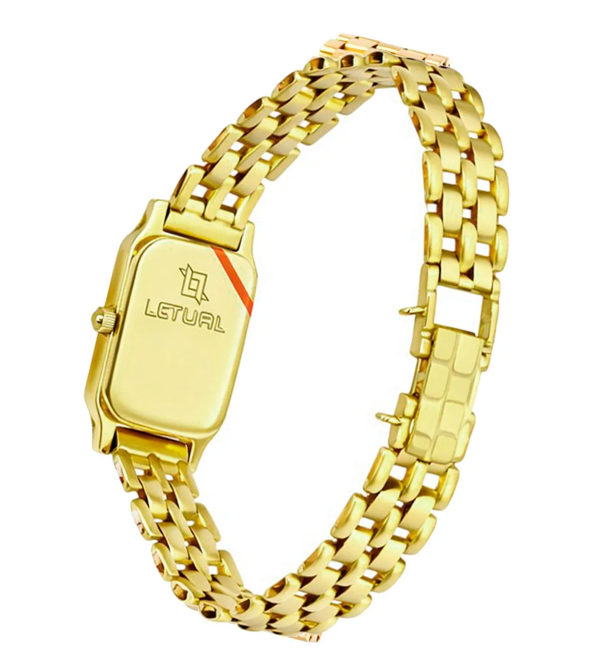 El diseño del reloj LETUAL combina la sofisticación clásica con detalles modernos. Su caja rectangular proporciona un estilo único, mientras que la esfera blanca con índices dorados y un segundero central agrega un toque de elegancia minimalista. El brazalete de eslabones perfectamente ensamblados asegura un ajuste cómodo y refinado, complementado por un cierre de seguridad oculto que añade funcionalidad y tranquilidad.