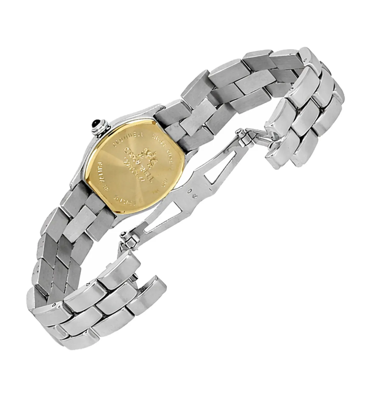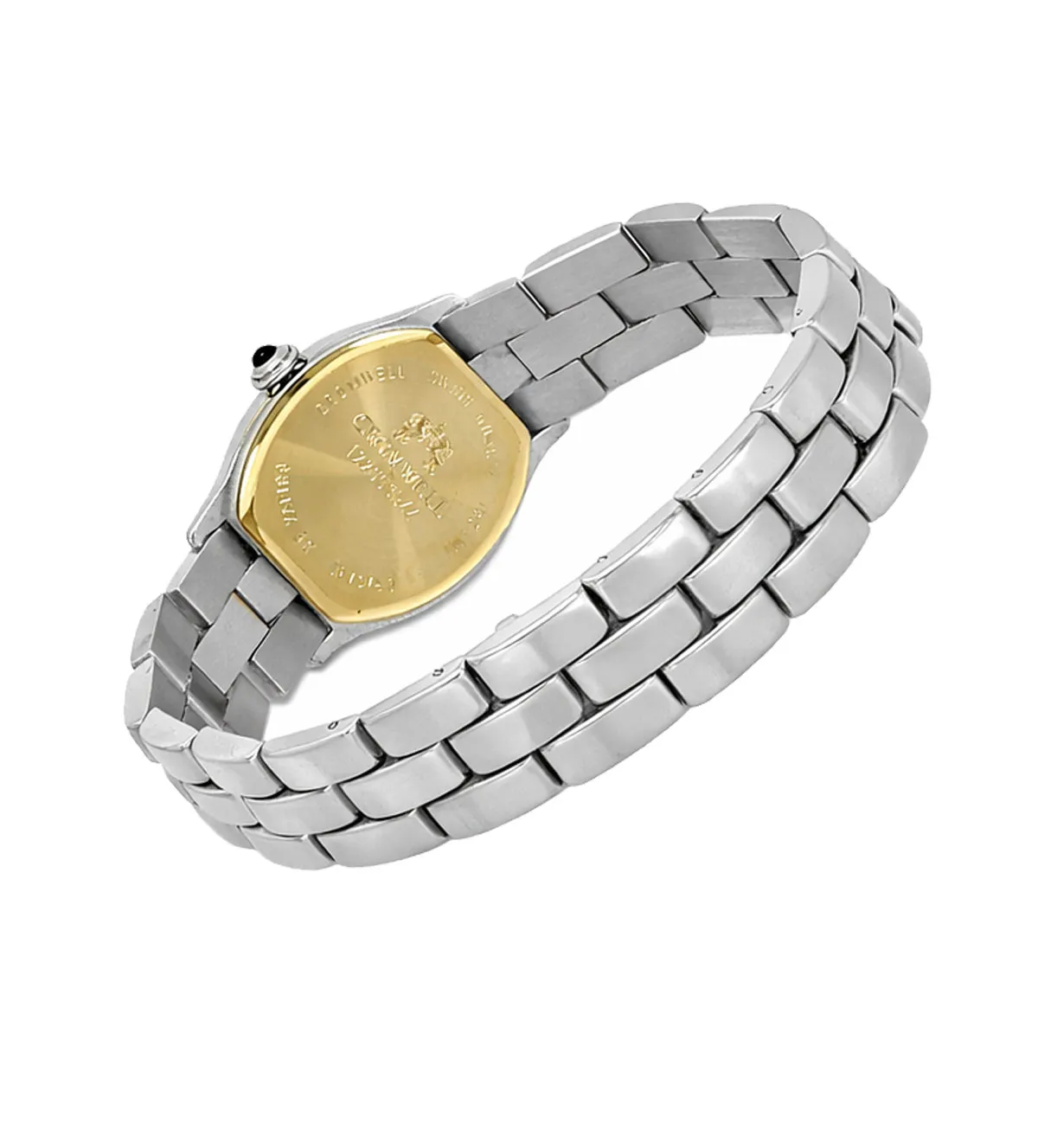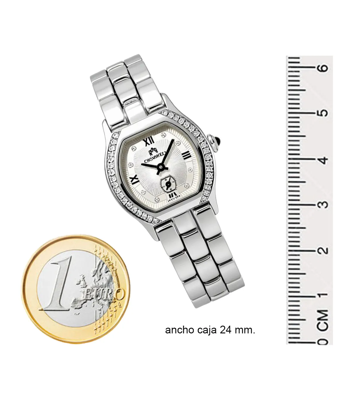 La caja presenta unas proporciones equilibradas de 26 x 24 milímetros, ideales para quienes buscan un reloj de presencia distinguida sin resultar ostentoso. El brazalete, con un ancho de 15 milímetros, se integra de forma natural con la caja mediante eslabones combinados de acabado brillante. El desarrollo total del reloj es de aproximadamente 21 centímetros, adaptándose cómodamente a la muñeca gracias a su diseño ergonómico y bien proporcionado.
