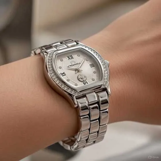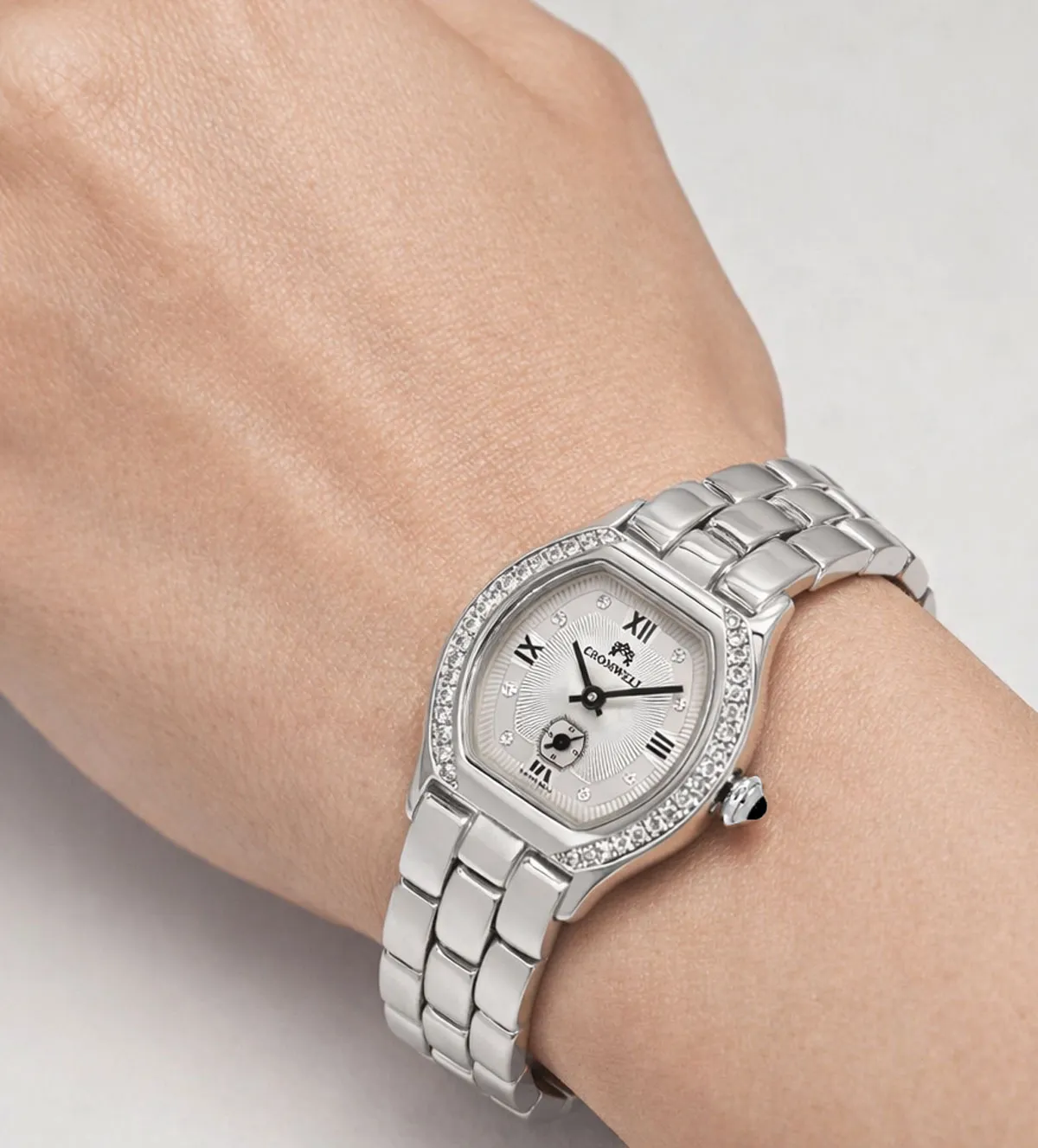 La caja de forma tonel aporta personalidad y sofisticación, alejándose de los diseños convencionales. Sus biseles laterales tipo galería están engastados con 36 diamantes talla brillante, repartidos de manera equilibrada para ofrecer un brillo elegante y nunca excesivo. La esfera blanca biselada refuerza la sensación de profundidad y pureza, mientras que la combinación de diamantes y números romanos marca las horas con un estilo clásico reinterpretado. El pequeño segundero cuadrado situado a las seis aporta un guiño a la relojería tradicional.