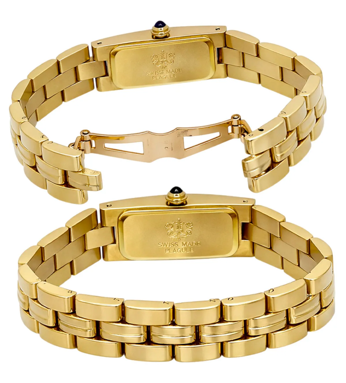 El diseño de este reloj de oro se define por su caja rectangular, una forma clásica que aporta personalidad y elegancia a la muñeca femenina. La esfera en tono champán ofrece una estética cálida y refinada, aunque también se presenta en versión blanca para quienes prefieren un estilo más luminoso. La numeración romana situada a las doce y a las seis aporta un guiño a la relojería tradicional, mientras que los índices en forma de palitos completan una lectura clara, equilibrada y sofisticada. El conjunto transmite lujo discreto y atemporal.