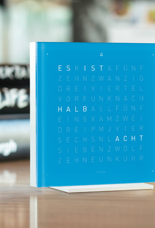 Qlocktwo Pure Series Blue Candy reloj de sobremesa 13.5 x 13.5 Cms. Reloj de sobremesa diseñado y creado por Qlocktwo y dem¡nominado “Caramelo Azul” “Blue Candy”.