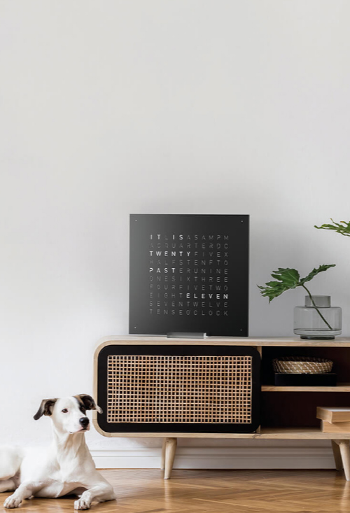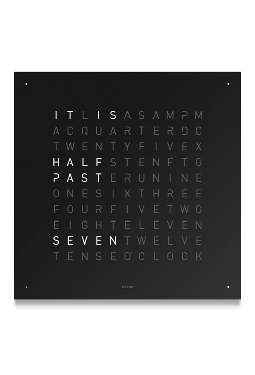 Qlocktwo Stainless Steel Black Pepper reloj de pared. Fabricado por los artesanos de Qlocktwo en acero inoxidable negro con recubrimiento de polvo mate, letras grabadas con laser.