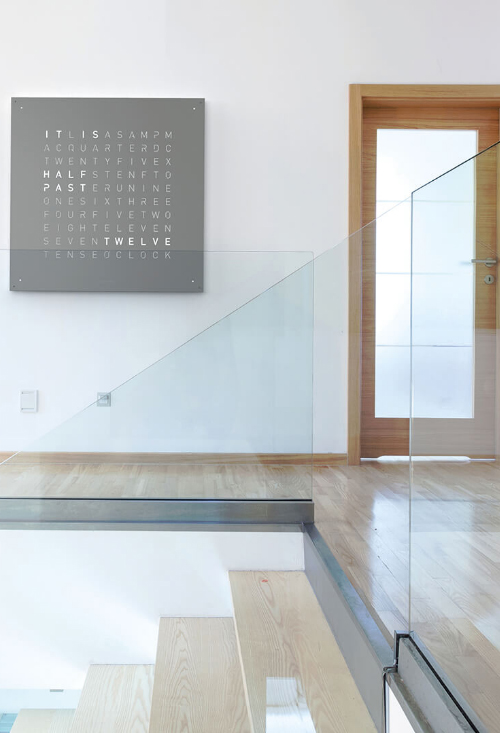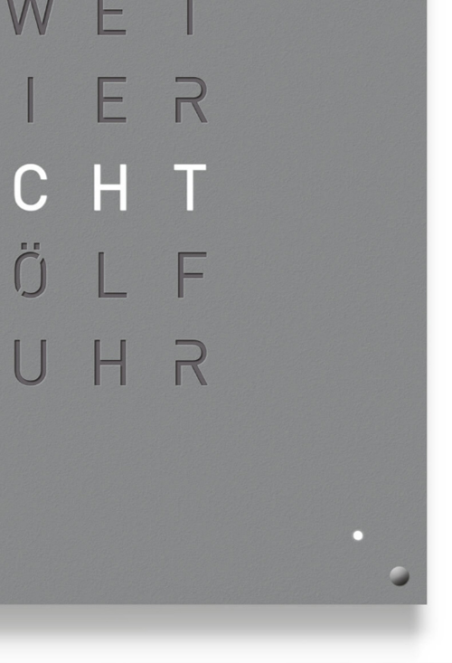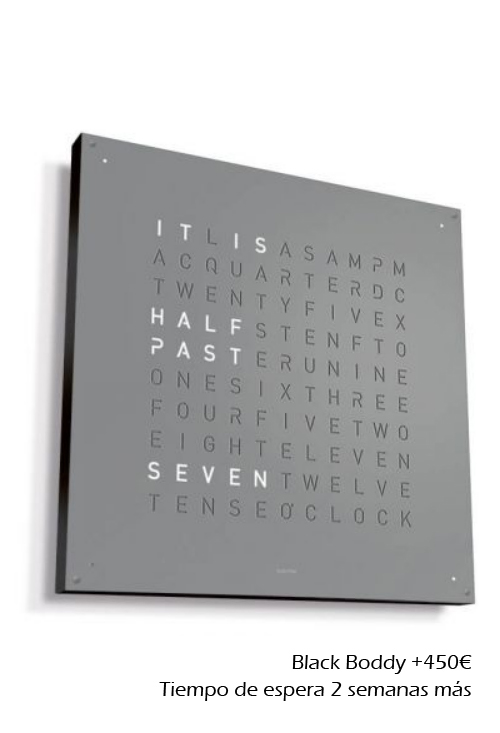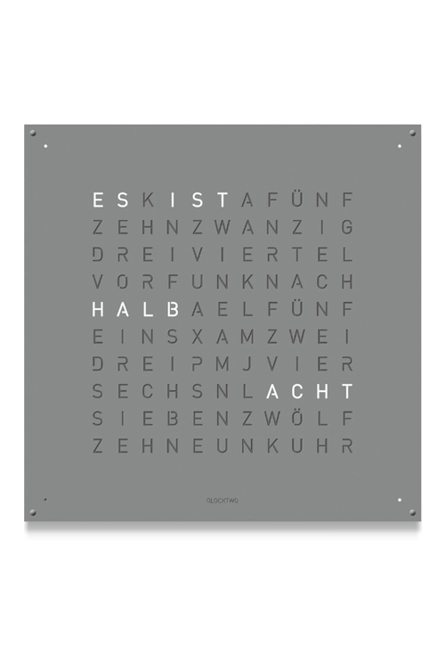 Qlocktwo Stainless Steel Gray pepper reloj pared grande 90×90 Cms Un reloj único, con una cubierta frontal de 90 x 90 centímetros, elaborado en acero inoxidable sometido a un proceso artesanal de cepillado.